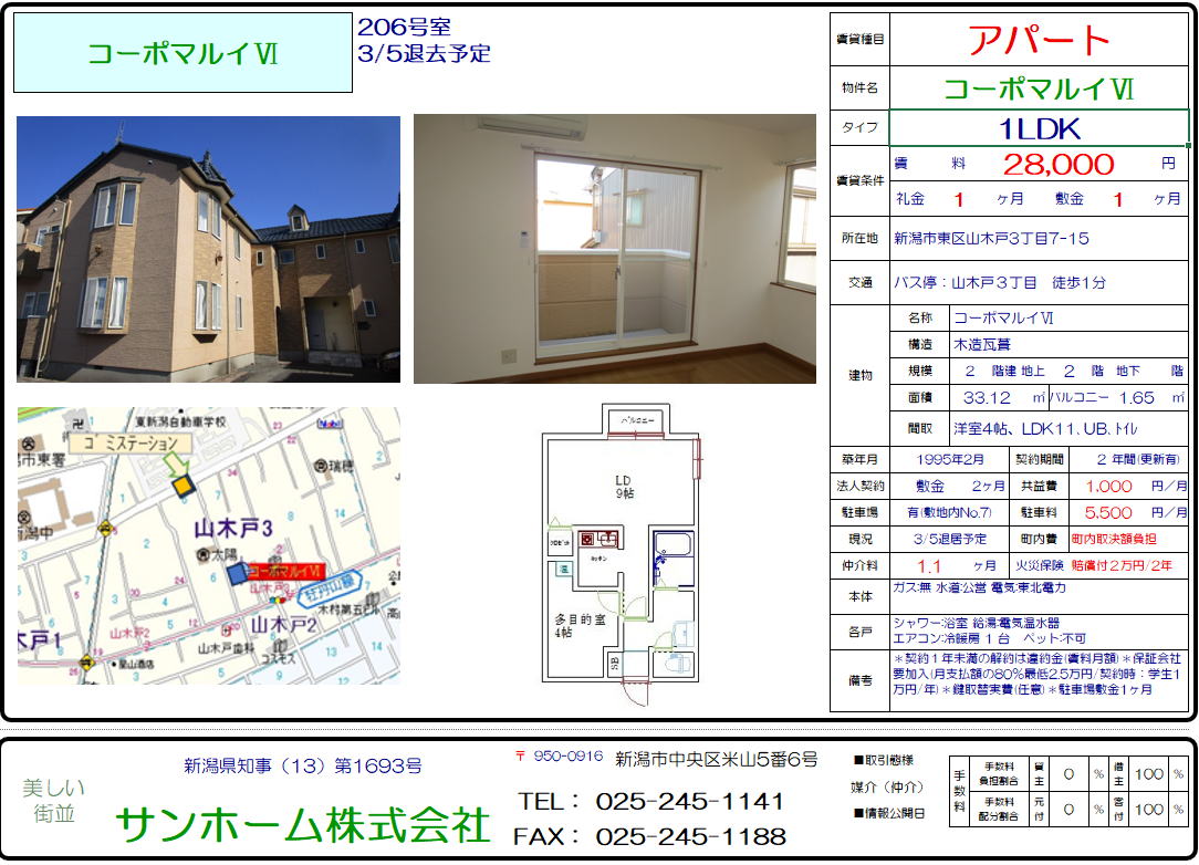 コーポマルイⅥ(新潟市東区山木戸3丁目7-15)1LDK 28,000円