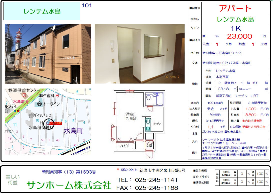 レンテム水島101(新潟市中央区水島町9-12)1K 23,000円