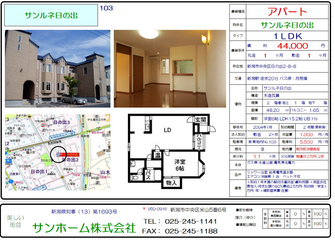 サンルネ日の出103(新潟市中央区日の出2-8-8)1LDK 44,000円