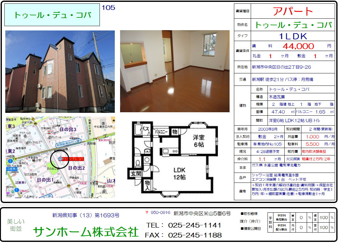 トゥール・ドゥ・コバ105(新潟市中央区日の出2丁目9-26)1LDK 44,000円
