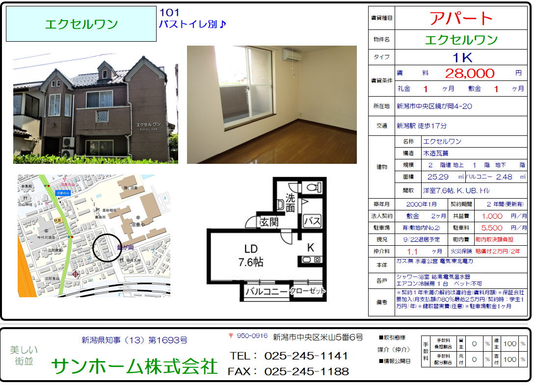 エクセルワン101(新潟市中央区鏡が岡4-20) 1K 28,000円