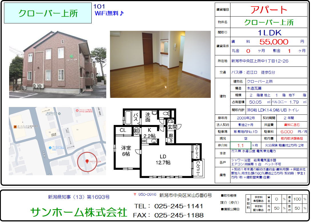クローバー上所101(新潟市中央区上所中1丁目12-26) 1LDK 55,000円