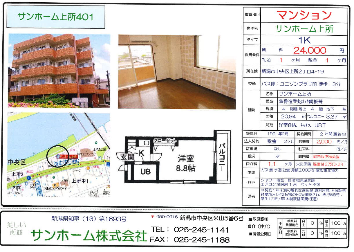 サンホーム上所401(新潟市中央区上所2丁目4-19) 1K 24,000円