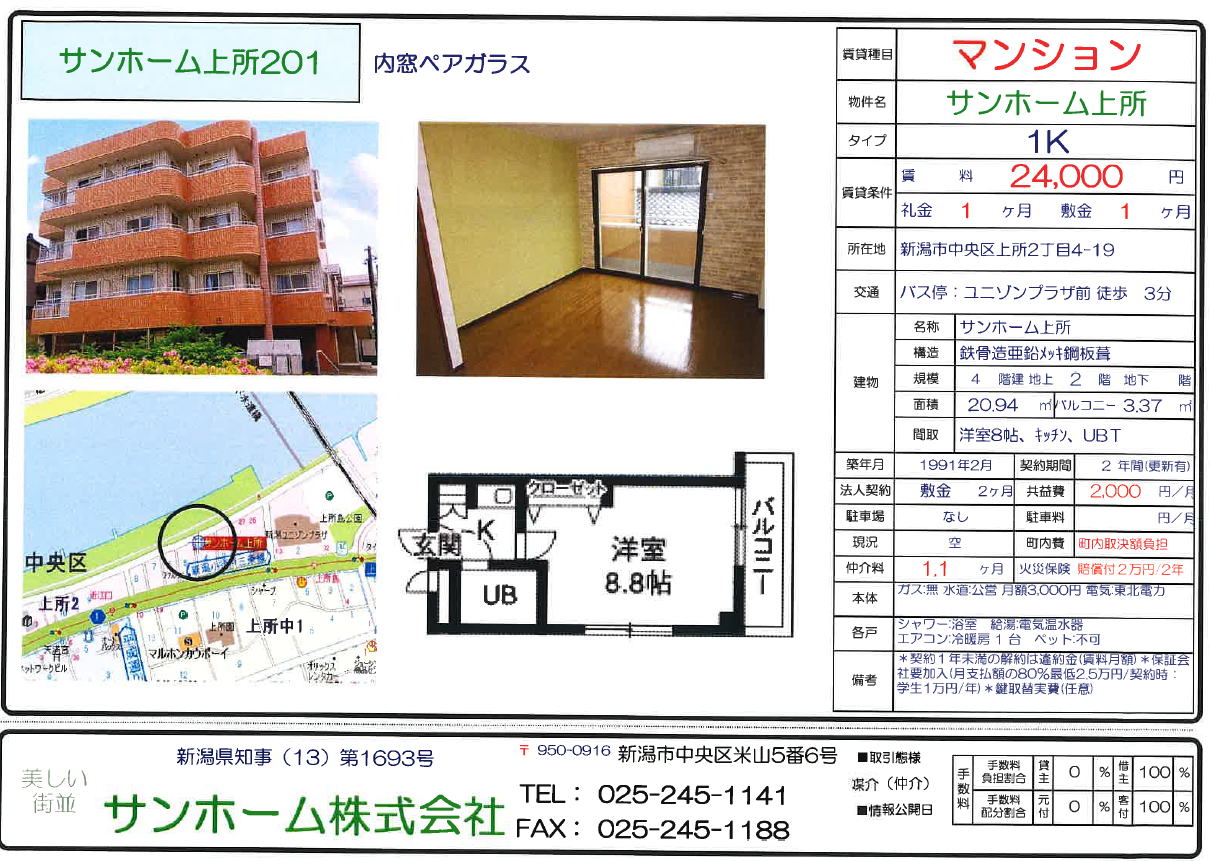 サンホーム上所201(新潟市中央区上所2丁目4-19) 1K 24,000円