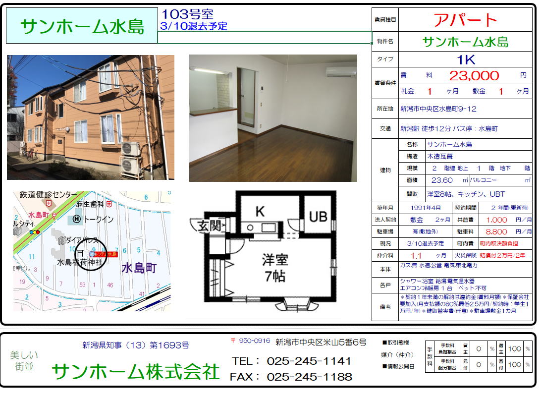 サンホーム水島103(新潟市中央区水島町9-12) 1K 23,000円